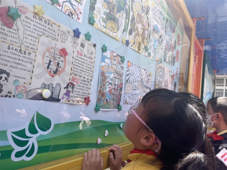 近日,定海区海山小学组织开展了禁毒宣传文艺作品展。禁毒宣传标语、禁毒主题宣传画、禁毒作品读后感……学生们积极参与宣传,将艺术元素融入禁毒宣传作品,进一步推动了“无毒”校园建设。通讯员 夏双双 摄