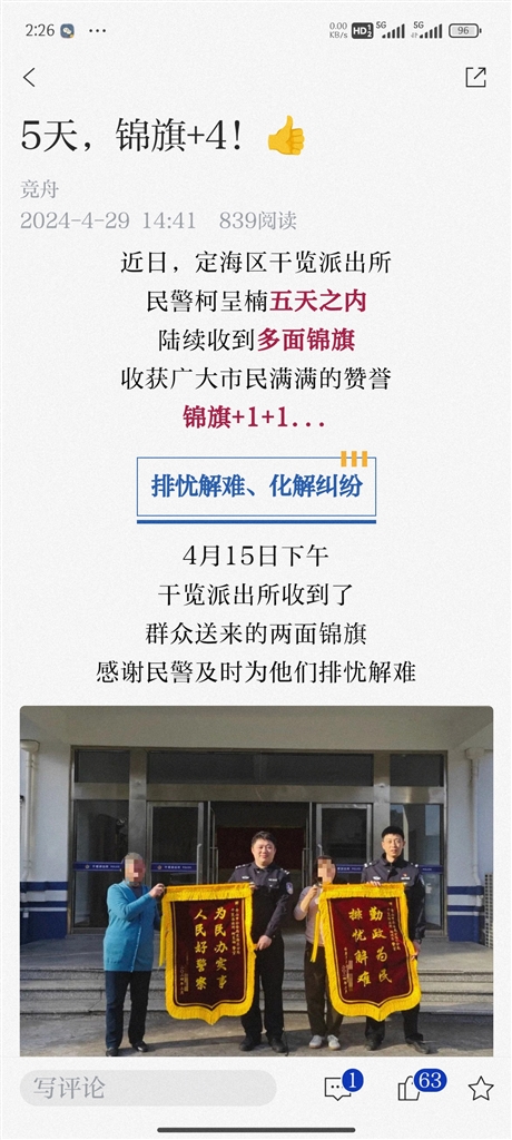 竞舟APP上的这篇报道,笔者读了深受感动。一位基层民警,孜孜不倦调解纠纷、满腔热情为民服务,接连受到群众点赞,了不起!但细细数了下,这位民警5天内收到了4面锦旗,再联想到不时见诸媒体的“送锦旗”新闻,欣喜之余也有些不安:这么多锦旗是否也会成为群众负担?