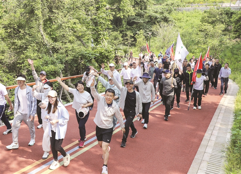当天上午9时许,集体登山活动正式开始。两家单位为一组从舟山儿童公园出发,沿鼓吹山五彩绿道一路前行,途经东鼓亭、小坪岗、鼓吹山驿站及沙井头等点位,最终返回起点。本次登山路线全程约6.5公里,干部职工们行走在郁郁葱葱的绿林中,尽情感受清风拂面的温柔和阳光暖人的舒适。