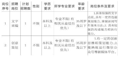 舟山传媒文化有限公司因事业发展需要,面向社会公开招聘2名工作人员(公司聘),具体要求如下: