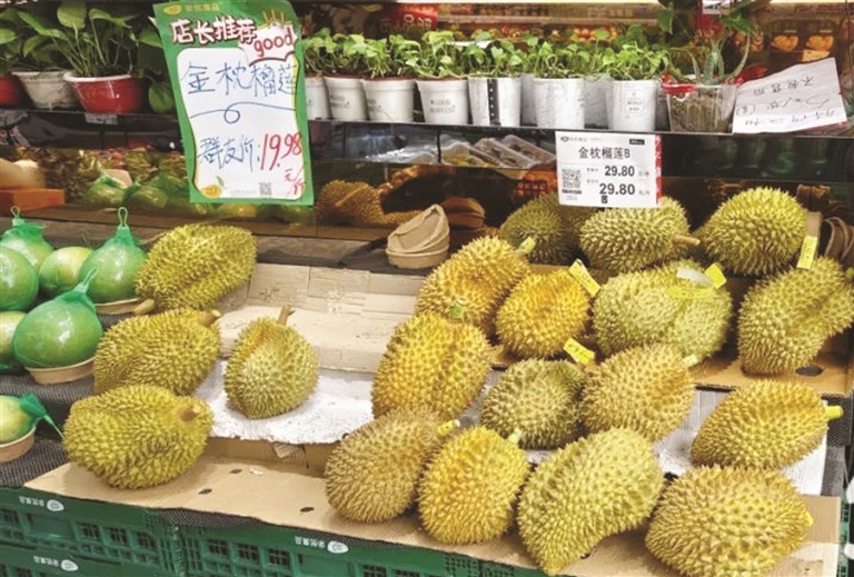 由于东南亚地区的榴莲主产区屡获丰收,越来越多的果子进入国内市场,加上南方产区同样盛产榴莲,大多数榴莲品种的零售价已跌破30元大关,部分水果店活动价更是做到19.98元/500克。普通消费者买一个榴莲的花费可以控制在百元左右。