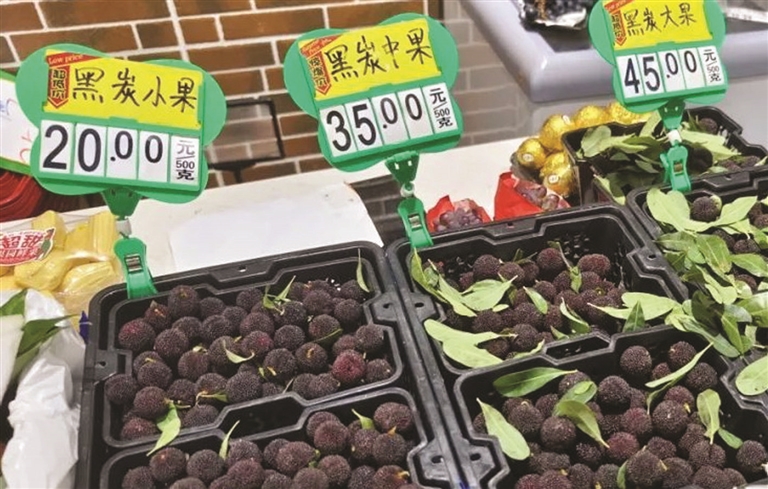 定海城区上架了杨梅的水果店,目前在售的杨梅还是云南杨梅,但价格从上月的大果88元/500克降价到45元/500克,接近“腰斩”;小果则降到20元/500克。