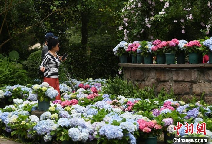 5月10日,重庆中心城区一无人自助鲜花集市吸引市民打卡。记者在现场看到,该集市将各色绣球花在树林里打造成一片缤纷花海,市民既能在此赏花、游玩,还可自助扫码支付购买盆栽。中新网 图