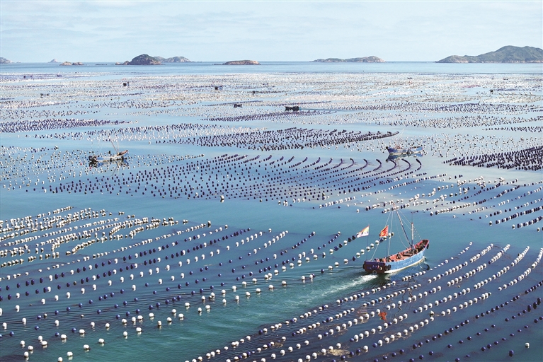 5月9日晨,嵊泗县枸杞岛万亩海上牧场,渔民们驾着小船穿梭在养殖贻贝的浮子间,忙着培育养殖的贻贝,构成了一幅美丽的蓝海牧场图