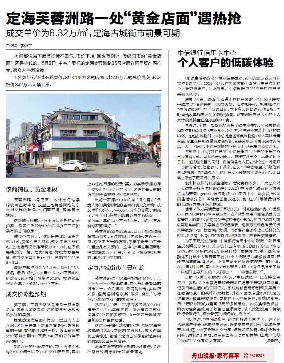 5月8日,由客户委托的定海芙蓉洲路35号店面在阿里资产网拍卖,遇众人热烈追捧,经89轮竞价最终以540万元成交,较起拍价342万元大幅上涨,按建筑面积折合单价为每平方米6.32万元(《舟山晚报》5月9日报道)。店面是老街的“温度计”,地处芙蓉洲路与东大街交界处的这一店面拍出好价钱,意味着古城老街前景可期。