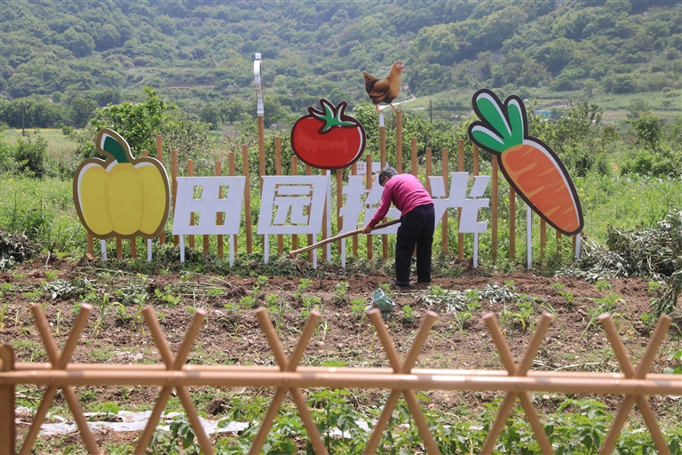 近日,在普陀区展茅街道大展村田公岙,当地一农民在自家田园内劳作,与附近的“田园拾光”节点景观相映成趣,构成一幅乡村美图