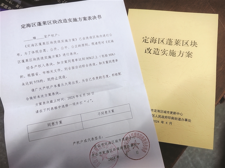 蓬莱新村的这家中介所负责人拿出一份盖了红印章的蓬莱区块改造实施方案的空白表决书,还有一本黄封面的改造方案小册子,说:“现在社区里在挨家挨户征求居民表决,到6月底截止。”