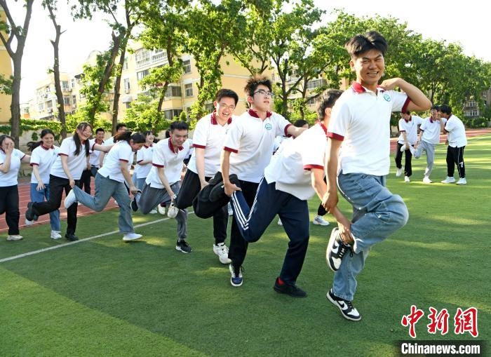 5月14日,安徽省淮南一中高三学生在团体心理辅导活动中参加趣味单脚跳游戏,增强学生精诚合作的团队精神。高考临近,安徽省淮南市开展形式多样的团体心理辅导活动,帮助高三学生释放身心压力,以更乐观、更自信的心态迎战高考。中新网 图