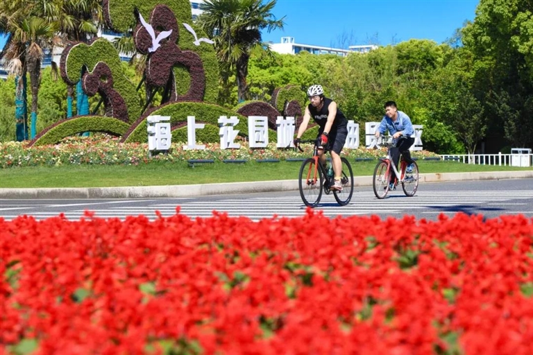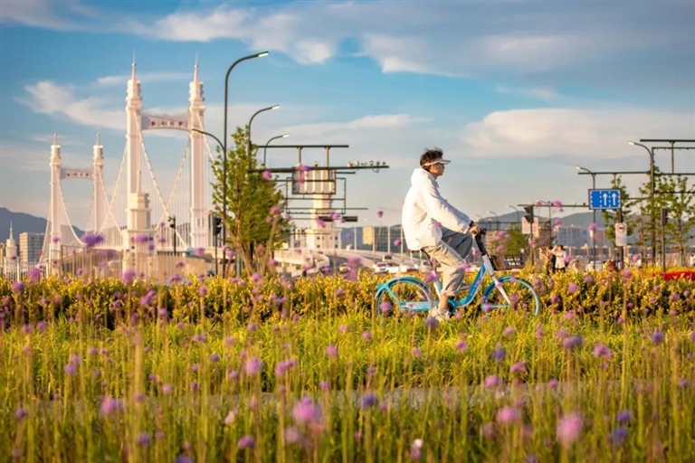 新城港岛大桥下,市民骑行在花间绿道 图/虞莉莉