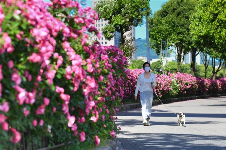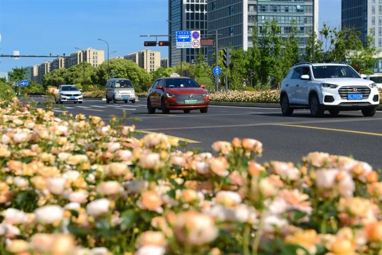 海天大道新城段,月季花绽放在马路两旁 图/姚凯乐