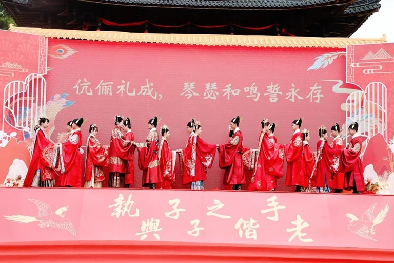 集体婚礼现场,满眼的中国红,营造出喜庆的中式婚礼氛围。在舞狮的引领下,在亲友及观礼嘉宾的注目下,10对新人身着明制婚服,共牵红巾,新娘团扇遮面,缓步走上舞台。