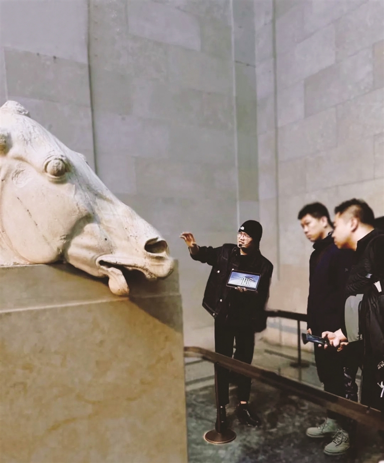 在人头攒动的馆内,小潘戴着耳麦、毛线帽,举着平板,使用中英双语对着游客侃侃而谈。小潘告诉记者,其实成为讲解员是一个巧合,“我对历史非常感兴趣,以前经常通过线上直播的方式讲述历史,在英国硕士毕业之后我发现可以在大英博物馆把这件事搬到线下。”随着时间的推移,小潘越来越感到自己对这份工作的热爱,“每天工作6~9小时,带领一群人穿梭于不同的古文明和历史当中。”