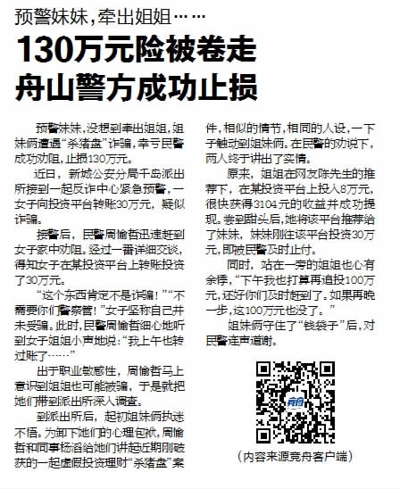 近日,新城公安分局千岛派出所接到一起反诈中心紧急预警,一女子向投资平台转账30万元,疑似诈骗。接警后,民警迅速赶到女子家中处置,结果预警妹妹、牵出姐姐,及时劝阻了身陷“杀猪盘”的两姐妹,止损130万元(《舟山晚报》5月16日报道)。灵敏的预警、有效的处置让“杀猪盘”“崩盘”,着实令人欣慰。