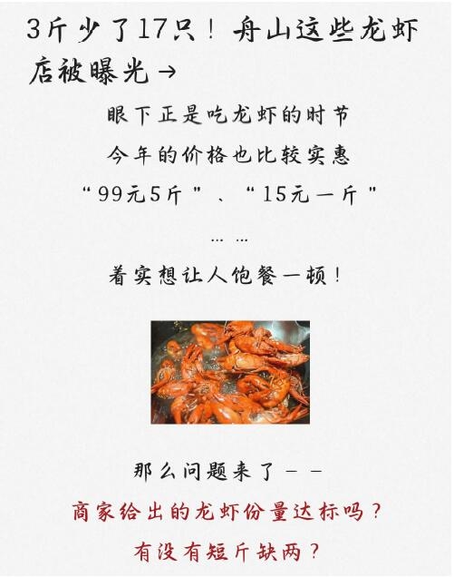最近,小龙虾很火。然而,一些商家却在斤两上动了歪脑筋。近期,舟山市场监管部门对部分龙虾店进行突击检查,发现普遍存在的短斤缺两的现象。例如,在定海芙蓉洲路上的一家外卖店,标称1.5千克的小龙虾,实际数量只有42只,比市场平均水平少了17只,重量上差了400多克。