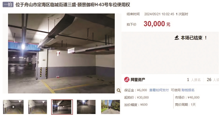 5月21日,位于新城三盛·颐景御府H-63号车位使用权拍卖,在阿里法拍网上落槌。这次拍卖,仅有一人报名竞价,以3万元的价格成交。这个车位拍卖的关注度不高,围观者不到一千人次。