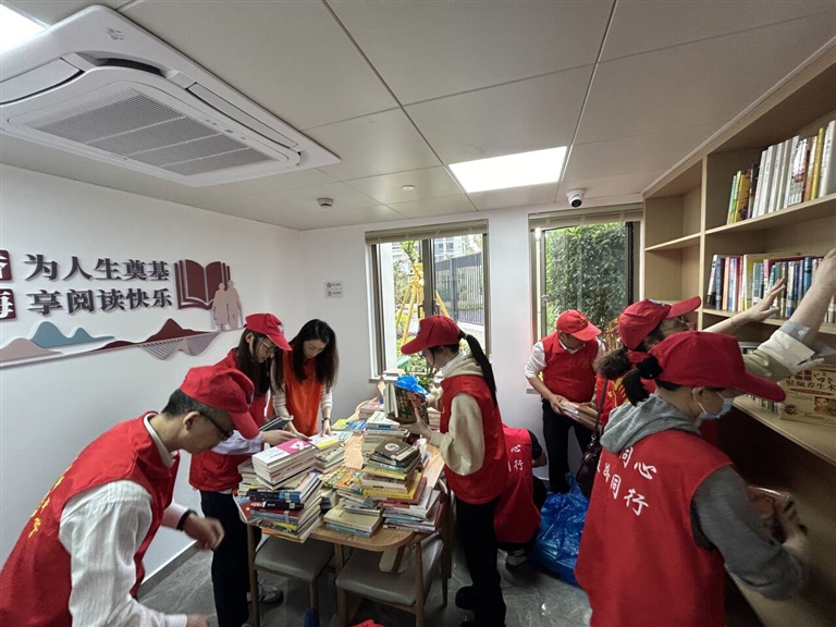 本报讯 昨天上午,市融慈善文化基地,近30名志愿者将社会各界捐赠的500册爱心图书分类、打包,随后送到定海区文慧社区居家养老照料服务中心,文慧未来社区慈善图书室正式投用,这也是市慈善总会“书循环·善循环”项目建设的第16个慈善图书室。