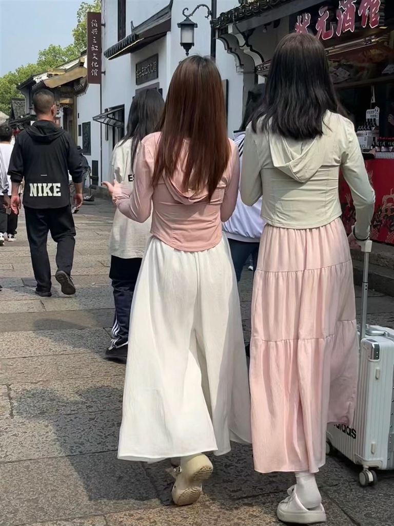 “这是我好朋友最喜欢的穿搭方式,适合温柔的女孩子穿,既能防晒,又很有气质,绝对是防晒衣穿搭里最受欢迎的方式。”大吉说,这种穿搭不挑身材,蛋糕长裙还能修饰腿型,防晒衣可以选择粉色、嫩黄色或者白色等比较活泼的颜色,版型可以是宽松的,也可以是紧身的,“这种穿搭比较容易模仿。”
