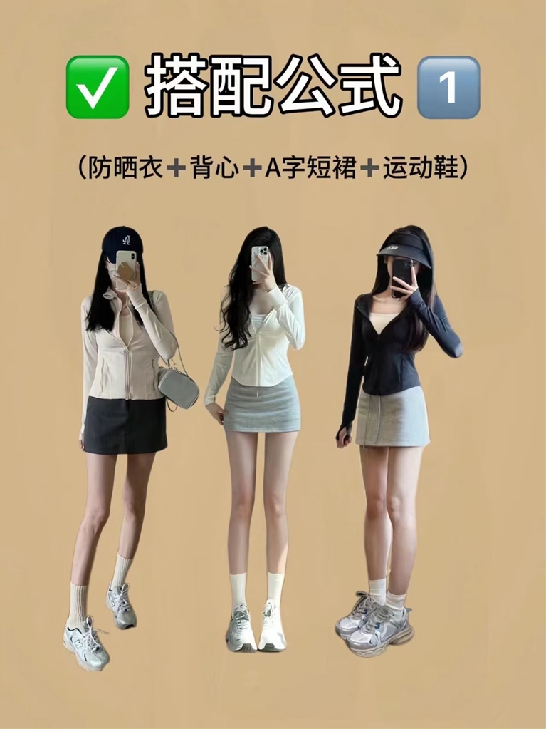 “防晒衣+背心+A字短裙+运动鞋”的青春活泼穿搭方式。