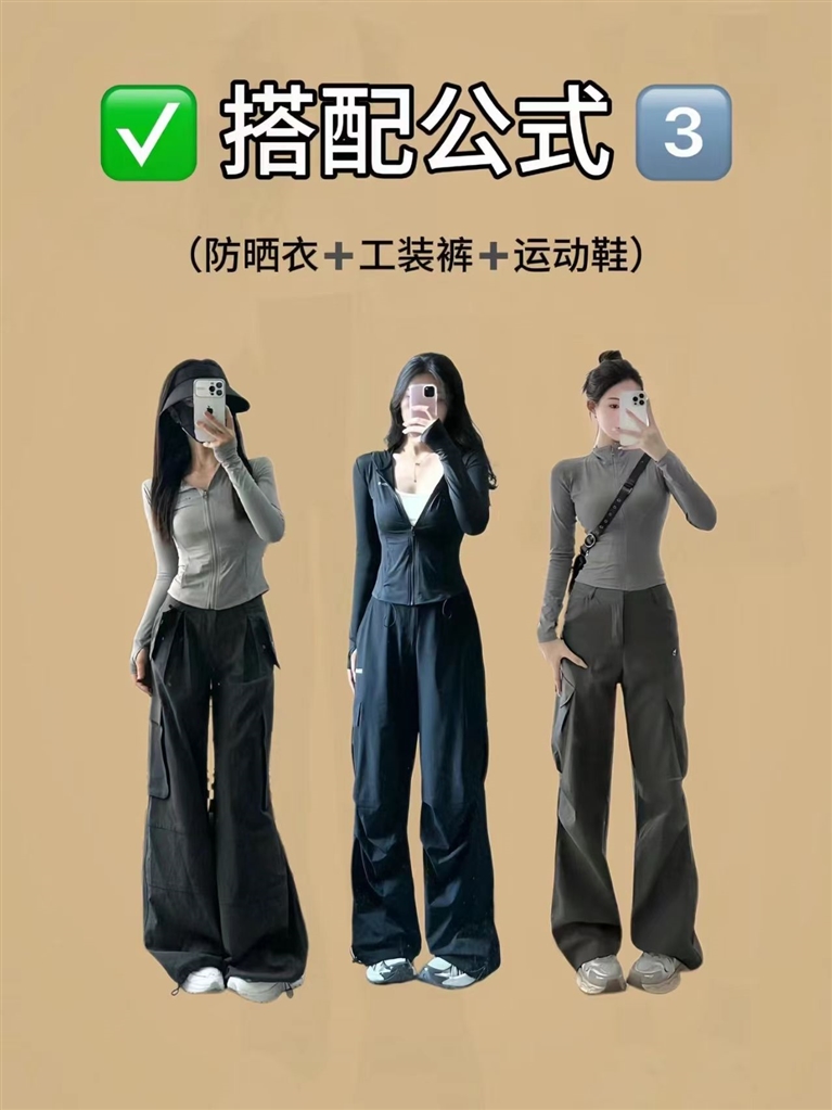 “防晒衣+工装裤+运动鞋”的辣妹休闲穿搭方式。