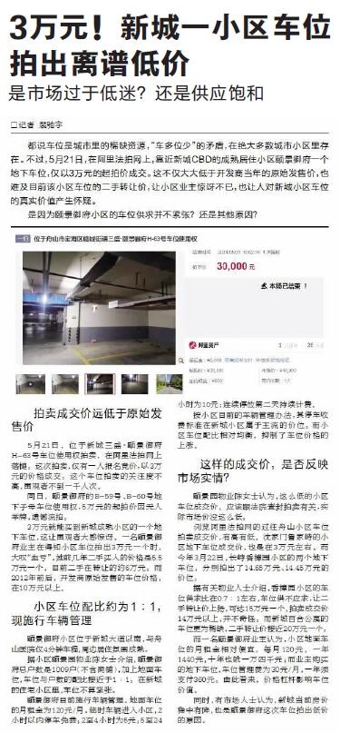 5月21日,在阿里法拍网上,靠近新城CBD的成熟居住小区颐景御府一个地下车位,仅以3万元的起拍价成交。这不仅大大低于开放商当年的原始发售价,也难及目前该小区车位的二手转让价,让很多人对新城小区车位的真实价值产生怀疑(《舟山晚报》5月23日报道)。“离谱低价”确实出乎意料,但也不必一惊一乍。