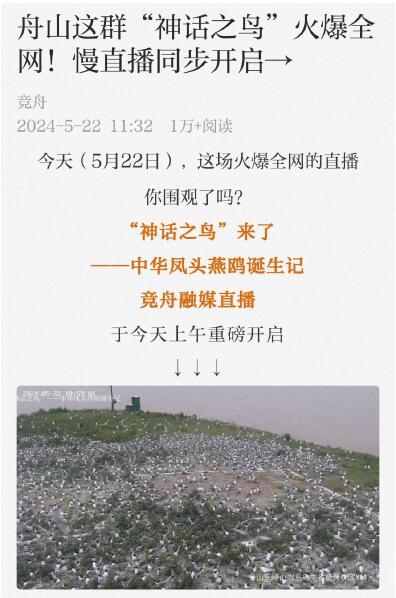 5月22日是第24个国际生物多样性日。当天上午,“神话之鸟”来了——中华凤头燕鸥诞生记竞舟融媒直播活动启动,以实景慢直播开启“云”观中华凤头燕鸥的新模式。直播在学习强国、人民日报、潮新闻、中国蓝等近20个平台同步推出。这场慢直播将持续至8月,想必可以让网友过足“神话瘾”。