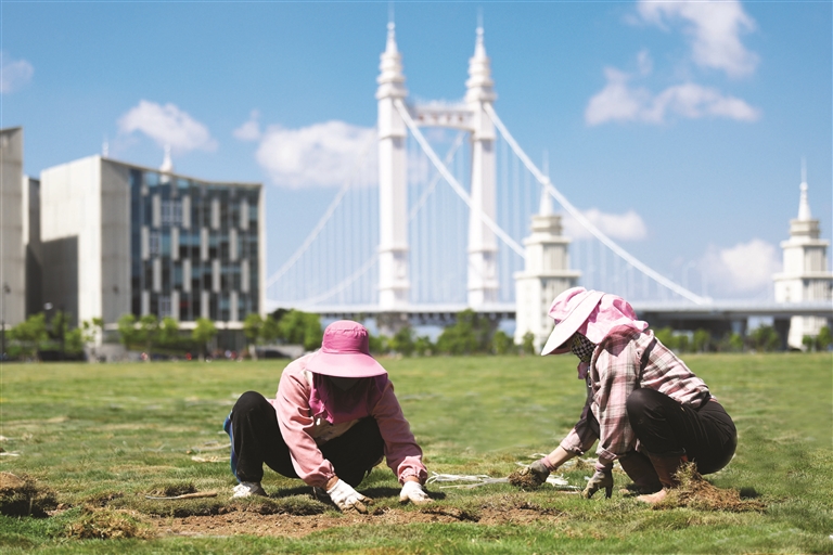 5月28日上午,在新城港岛大桥东侧地块上,园林工人们正在铺种草坪,计划本周内全部完工。据了解,该地块总面积超过9万平方米,除了正在铺种的草坪外,还有一片马鞭草花海预计将在6月底绽放,与市民见面。记者 姚凯乐 摄