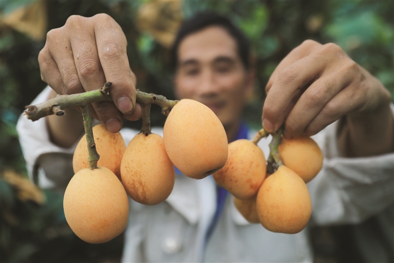 5月27日,在普陀六横镇龙山新村附近一果园内,果农刘永种植的解放种枇杷迎来采摘并上市,个头比鸡蛋还大,着实喜人。据了解,该农户种植有300棵枇杷树,品种包括解放种、白枇杷、大五星、大红袍等,均已成熟。
