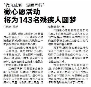 5月28日,《舟山晚报》报道,市残联、市慈善总会联合主办“微光成聚 温暖同行”圆梦微心愿全国助残日公益活动。同日,《舟山日报》报道,由市慈善总会、市民政局、市新闻传媒中心联合举办的“圆梦六一”微心愿活动正在进行,活动发布的100个微心愿已有66个被认领。