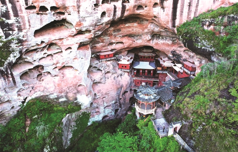 甘露岩左壁有飞瀑垂岩,洞窟内窄外敞,呈倒三角形,左右两角有龙凤形钟乳石,常年滴水,甘洌沁心,类同甘露,故得名“甘露岩”。寺庙巧借岩势,全木构悬空造架于其间,极尽巧思。甘露寺始建于南宋绍兴十六年(1146年),直到20世纪中叶的一场全国性文物普查,这座名岩古刹的重要价值才被真正认识。图为5月28日,隐于福建省泰宁县大金湖的丹霞峰丛之中的甘露岩。(无人机照片) 中新网 图