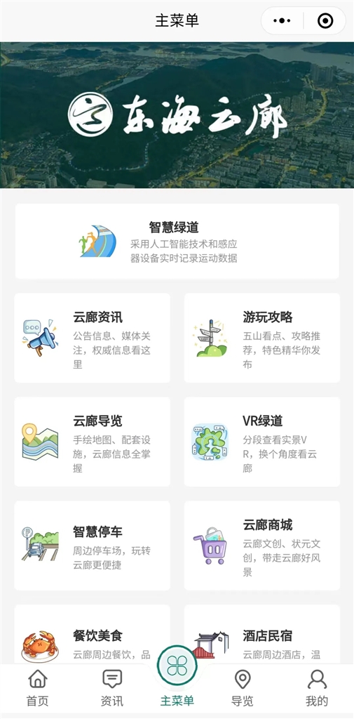 打开微信,搜索“东海云廊小程序”,即可找到该小程序。点击进入该小程序主菜单,可以看到智慧绿道的全套玩法规则,云廊各个景点的详细介绍和定位,云廊沿线的吃、住、行、游、购、娱等相关资讯,以及东海云廊的最新最全旅游攻略和活动信息。