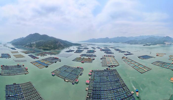 空中俯瞰福建宁德三都澳海上牧场,蔚为壮观。近年来,福建省大力推进海上养殖综合整治,清退海上禁养区渔业设施,拓宽海上航道,用新型材料替代破旧渔排和白色泡沫球,促进海洋渔业转型升级。养殖户大力发展深远海养殖,推动海洋渔业向深海型、集约型、高端型转变。 中新网 图