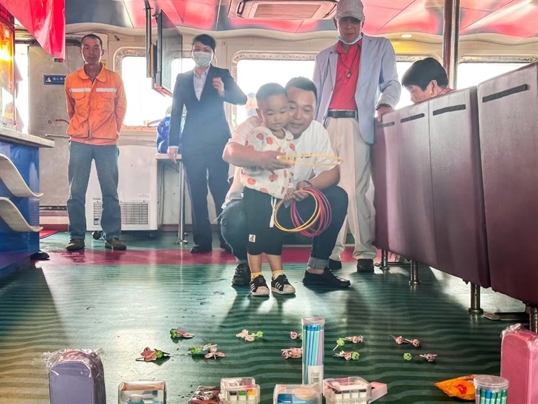 昨天,岱山蓬莱客运公司在“蓬莱仙岛”轮(岱山竹屿开往衢山)上举行迎“六一”主题系列活动,船上旅客和孩子们有幸参加彩虹套圈、你画我猜等亲子游戏。儿童节当天,由蓬客营运的岱山水域航线14周岁及以下儿童免票。