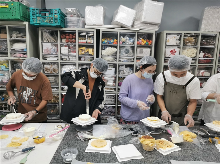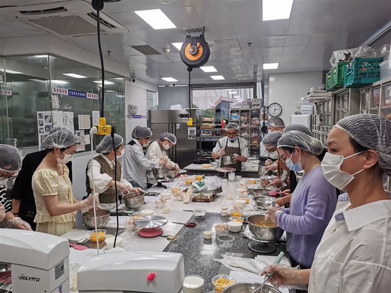 混合搅拌、过筛、煎皮、抹奶油……学员们按照老师讲解的方法步骤和技术要领,亲手体验操作,边动手边闲聊,轻松而愉悦。