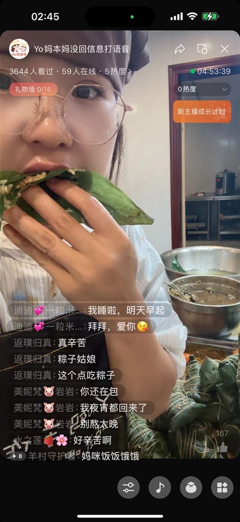“我开直播的目的很简单,就是想让我的顾客看到我包粽子用的食材、粽子的新鲜程度,让他们吃得放心。”YO妈选择在微信开直播也主打一个“陪伴”,每次包到半夜困得撑不下去的时候,都是直播间的姐妹陪她聊天,陪她撑过了半夜最难熬的时候。