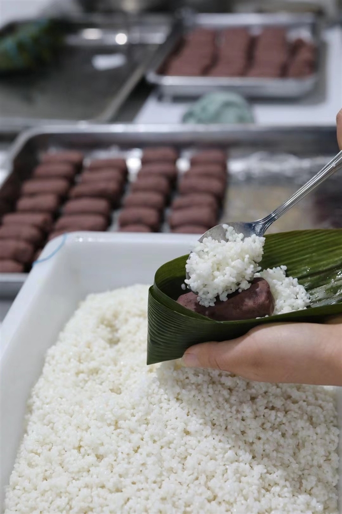 过去,提到粽子,南咸北甜泾渭分明,但是近两年这个边界已经非常模糊了。现在舟山人对于甜粽也很喜欢,桂花豆沙粽、蜜枣粽的销量也不输蛋黄肉粽。在陕西读过4年大学的小唐说:“西北的蜜枣粽真的很好吃,蘸点白糖味道很绝。”以前她在舟山只吃过肉粽和碱水粽,没想到甜粽是那种甜糯的口感,也非常好吃。