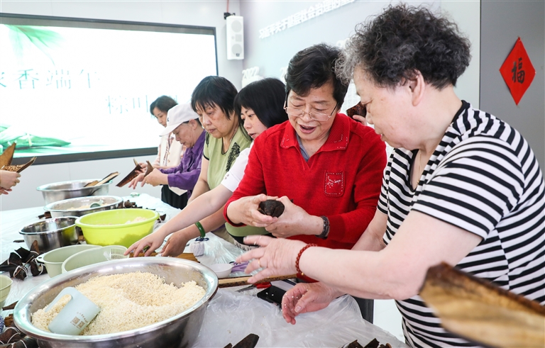 昨天,定海环南街道南珍社区举行“浓香端午粽传情”活动,社区工作人员和居民们齐聚党群服务中心,相互传授包“粽”技巧,增进邻里情,营造出浓厚的节日氛围。