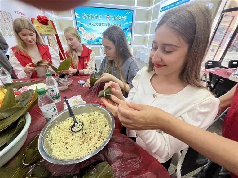 活动中心还开展了丰富的端午文化体验项目。留学生们体验了制作香包和包粽子,煮好的粽子香气四溢,让大家品尝到了端午节的传统美食。