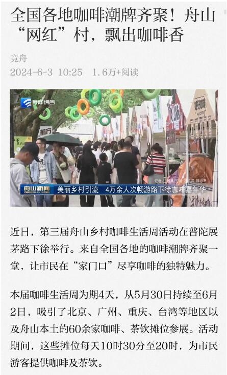 5月30日至6月2日,第三届舟山乡村咖啡生活周在普陀区展茅街道路下徐举行。来自舟山本土及全国各地的60余个咖啡品牌现场设摊,为市民游客送上一场咖啡盛宴。