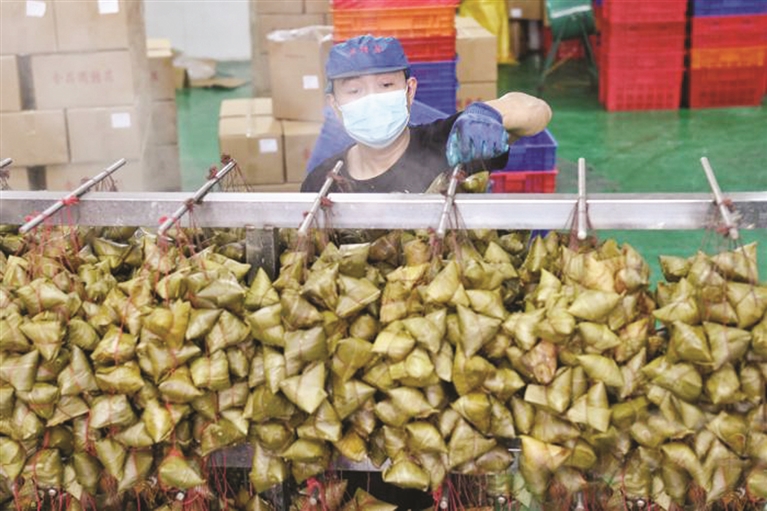 6月5日,湖南浏阳市关口街道道源湖村的村民们忙碌着制作粽子,该村连日来日销手工粽超百万个。据了解,道源湖村人口5000余人,有一半以上的人从事与粽子相关的行业,2023年粽子产业年产值超1.3亿元,是名副其实的“粽子村”。 中新网 图