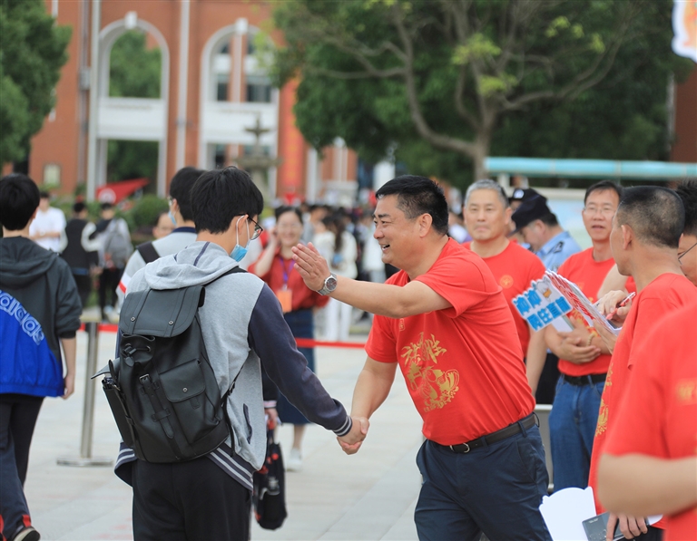 昨天上午7时40分,舟山中学考点门口,考生入场前,南海实验学校高中部老师岳娟和其他老师给予他们温暖的拥抱,缓解学生紧张情绪。老师们还和学生握手、击掌“加油”。“希望可以从老师那里沾到好运气,说不定能获得解题的灵感,让今天的开场顺顺利利。”一名考生说道。