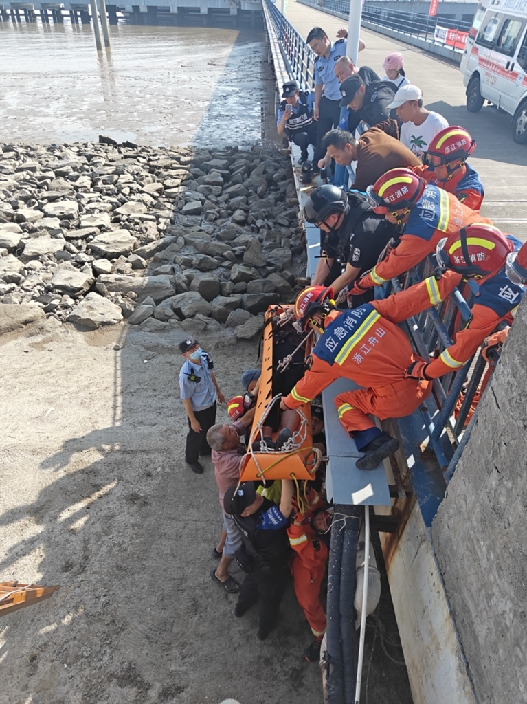 6月9日14时57分,舟山市消防救援支队普陀山大队接到报警称:在朱家尖海洋维权巡航执法基地西侧100米的海塘处有人被困。