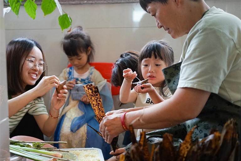 新城桃湾六区,长辈教小朋友包粽子 图/鲍恺乐