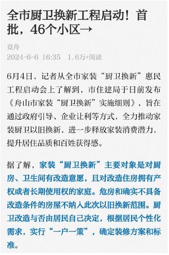 市住建局日前发布《舟山市家装“厨卫换新”实施细则》,将通过政府引导、企业让利等方式,全力推动家装厨卫以旧换新,进一步释放家装消费潜力,提升居住品质和百姓获得感。旧的不去新的不来,这真是一次好机会。