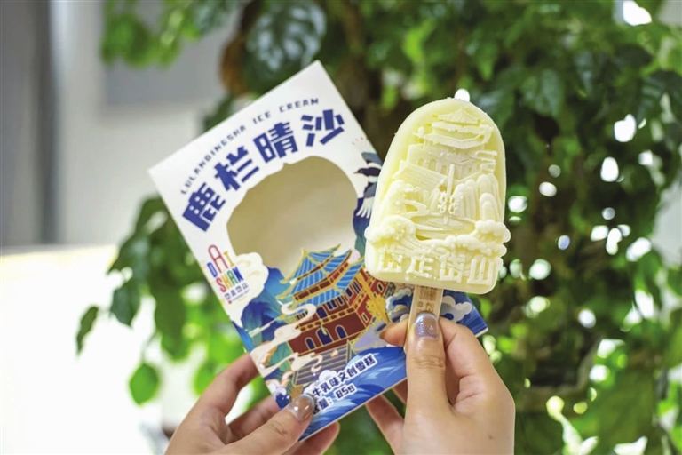 海盐牛乳味的“鹿栏晴沙”文创雪糕造型来自鹿栏晴沙雀楼、定海神针等标志性景点,游客可以手持雪糕,以雀楼或海坛为背景拍照。