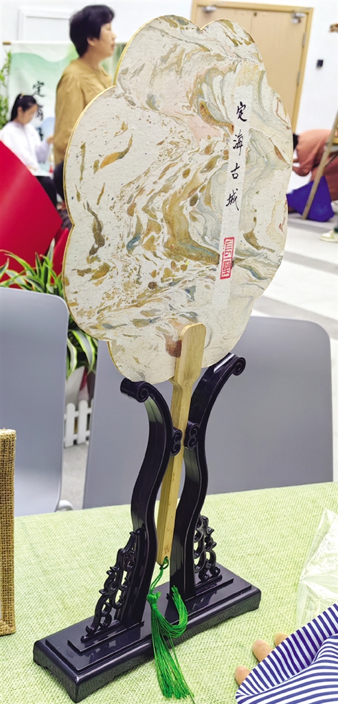 6月8日上午,24岁的市民刘雅琳在定海图书馆的端午市集体验了一把非遗手作:随性在水中滴入大漆颜料,手持白色扇面浸入水中,几秒后一把色彩交织、纹路写意的漆扇就初步成形了,“之后在上面写几个毛笔字,印一个闲章,非常好看。”刘雅琳告诉记者,漆扇制作如今在全国各地尤其是景区里很流行,没想到在舟山也能体验到。