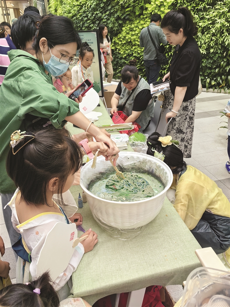 定海区汉文化协会副会长江楠告诉记者,将非遗技艺带入课堂、带上街头是她和协会成员们一直在做的事。将复杂的非遗技艺简化成群众容易参与、作品容易保留的形式是其中相当重要的一环。