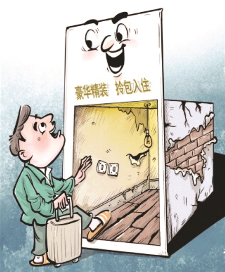 连大有告诉记者,除了用材用料降标减配、虚假宣传外,一些精装房还存在质量问题,比如漏水、墙体开裂、墙布鼓包、门窗破损等。