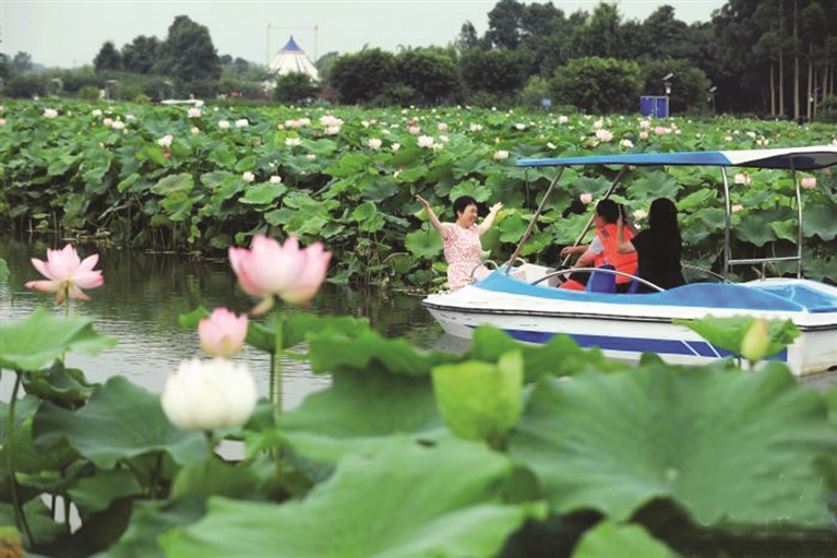 6月12日,游客在游船上赏花拍照。近日,四川省成都市新津区安西镇的千亩荷塘迎来了最佳观赏期,竞相开放的荷花吸引许多游客前来赏花拍照。 中新网 图