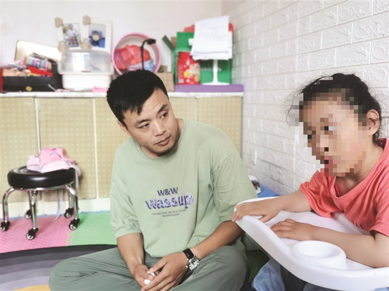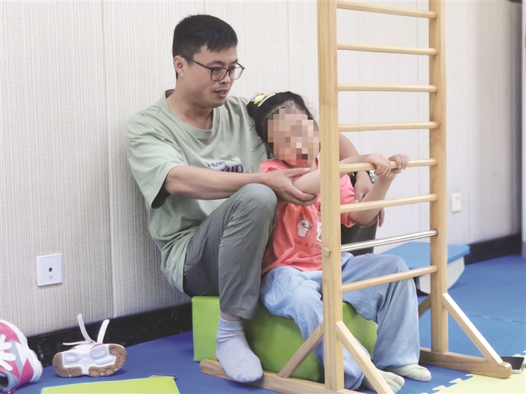 在孩子4个月的时候,有医生介绍,市残联有个康复指导中心。他便每天风雨无阻陪伴她们去那里做健康训练。康复师怎么做,他也在一旁学,有疑问就请教。下课或是回家后,他就继续给孩子“依样画葫芦”地训练,不停提醒“手放好,身子不要歪”,一顿操作下来,他常常满头大汗。