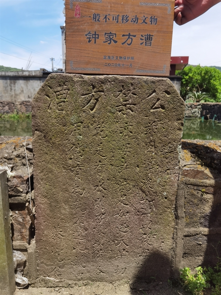 金塘钟姓家族,源于宁波镇海区庄市镇的钟包村。钟包村又名横河堰,一条横河蜿蜒穿越小村落,有苏、钟、包三姓沿河建村,故人称苏钟包。著名的世界船王包玉刚先生就出自钟包村。镇海一带,确实也存在以“漕”“漕头”来命名水池的地名现象。如庄市菱漕头,位于东钱村,村南边挖了一口池塘,一亩左右,该漕(池塘)四周用石砌起来,其中两只漕角很像菱角,故取名菱漕头。无独有偶,查阅资料,发现宁波地区其实有不少“漕头”相关地名,其地名渊源多与“河漕”有关。由此可见,金塘大象村钟家的“方漕”,其名称也源于浙东水文化,反映了由浙东移民所带来的水文化传承现象。